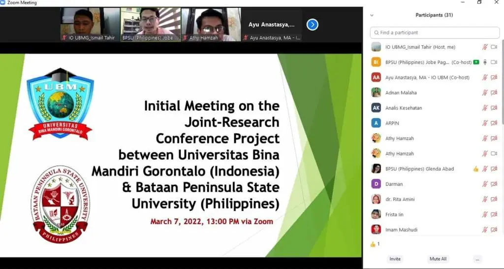 Kampus.UBMG - Keseriusan Universitas Bina Mandiri (UBM) Gorontalo dalam mewujudkan visi mengglobalnya semakin nyata. Kali ini, UBM Gorontalo bersama Bataan Peninsula State University (BPSU) menyelenggarakan penjajakan kerjasama melalui video conference zoom meeting, Senin (7/3/2022).
