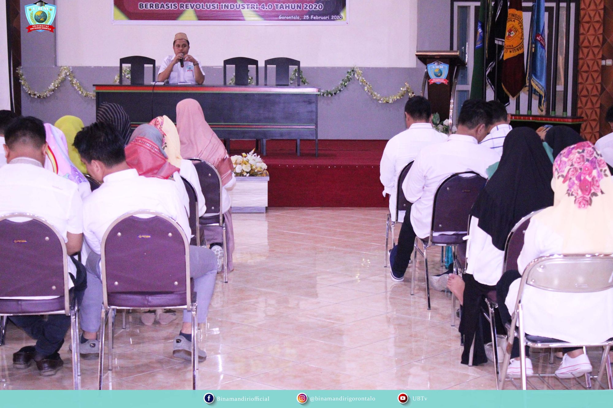 KAMPUS UBMG - Seluruh unsur pimpinan, dosen & staf di lingkungan Yayasan Bina Mandiri Gorontalo mengikuti siraman rohani. Jum'at (28/2). Kegiatan yang digelar di Ballroom Bina Mandiri Gorontalo ini merupakan agenda bulanan yang rutin dilaksanakan oleh Yayasan Bina Mandiri Gorontalo (YBMG). Ketua Badan Pelaksana Harian (BPH) YBMG, William Indra S. Mooduto SE, MSA, Ak.CA. dipercayakan sebagai pemberi materi siraman rohani kali ini.