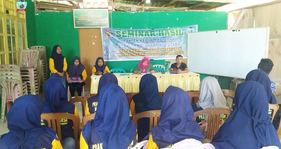 Pelaksanaan Kegiatan Praktek Kesehatan Masyarakat Desa (PKMD) Mahasiswa Program Studi Analis Kesehatan, Fakultas Sains, Teknologi dan Ilmu Kesehatan, Universitas Bina Mandiri Gorontalo di Desa Dulamayo Utara dan Dulamayo Selatan, gelombang pertama telah usai. Seluruh rangkaian kegiatan PKMD ini ditutup dengan presentasi hasil, dan capaian program yang telah dijalankan selama masa PKMD, dari masing masing kelompok yang tersebar di dua desa yang ada di Kabupaten Gorontalo ini.