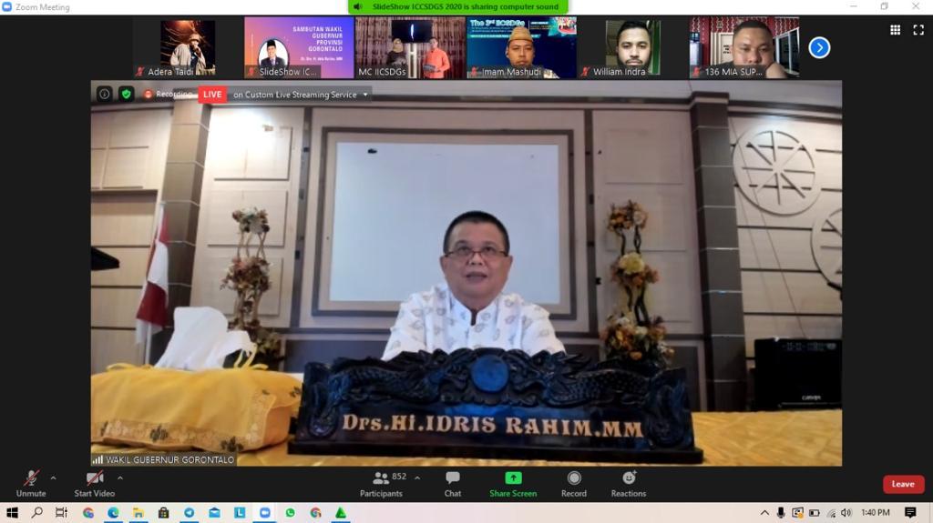 Webinar internasional ini dibuka langsung oleh Wakil Gubernur Gorontalo, Dr. Idris Rahim MM. Dalam sambutannya, Wagub dua periode ini menyampaikan upaya Pemerintah Provinsi Gorontalo dalam menangani pandemi Covid-19 dengan melakukan realokasi dan refocussing dana APBD tahun anggaran 2020. Realokasi anggaran tersebut difokuskan pada penyediaan sarana prasarana kesehatan, Jaring Pengaman Sosial, serta pemberdayaan masyarakat melalui stimulus ekonomi khususnya untuk sektor Usaha Mikro, Kecil dan Menengah (UMKM).