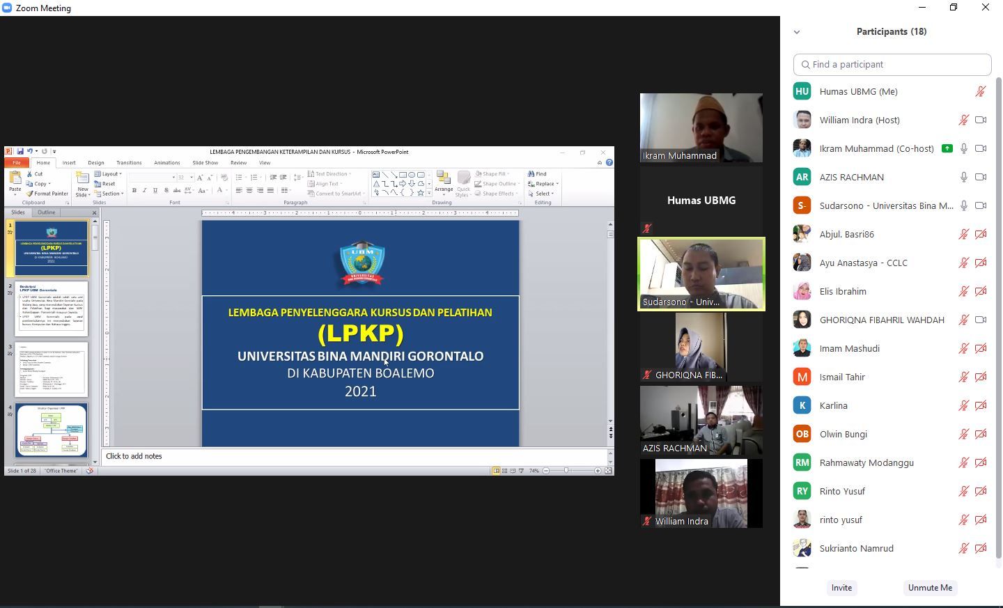 Kampus UBMG – Universitas Bina Mandiri (UBM) Gorontalo saat ini tengah menyiapkan unit usaha baru yang bergerak di bidang jasa yakni, Lembaga Penyelenggara Kursus dan Pelatihan (LPKP) UBM Gorontalo di Kabupaten Boalemo.