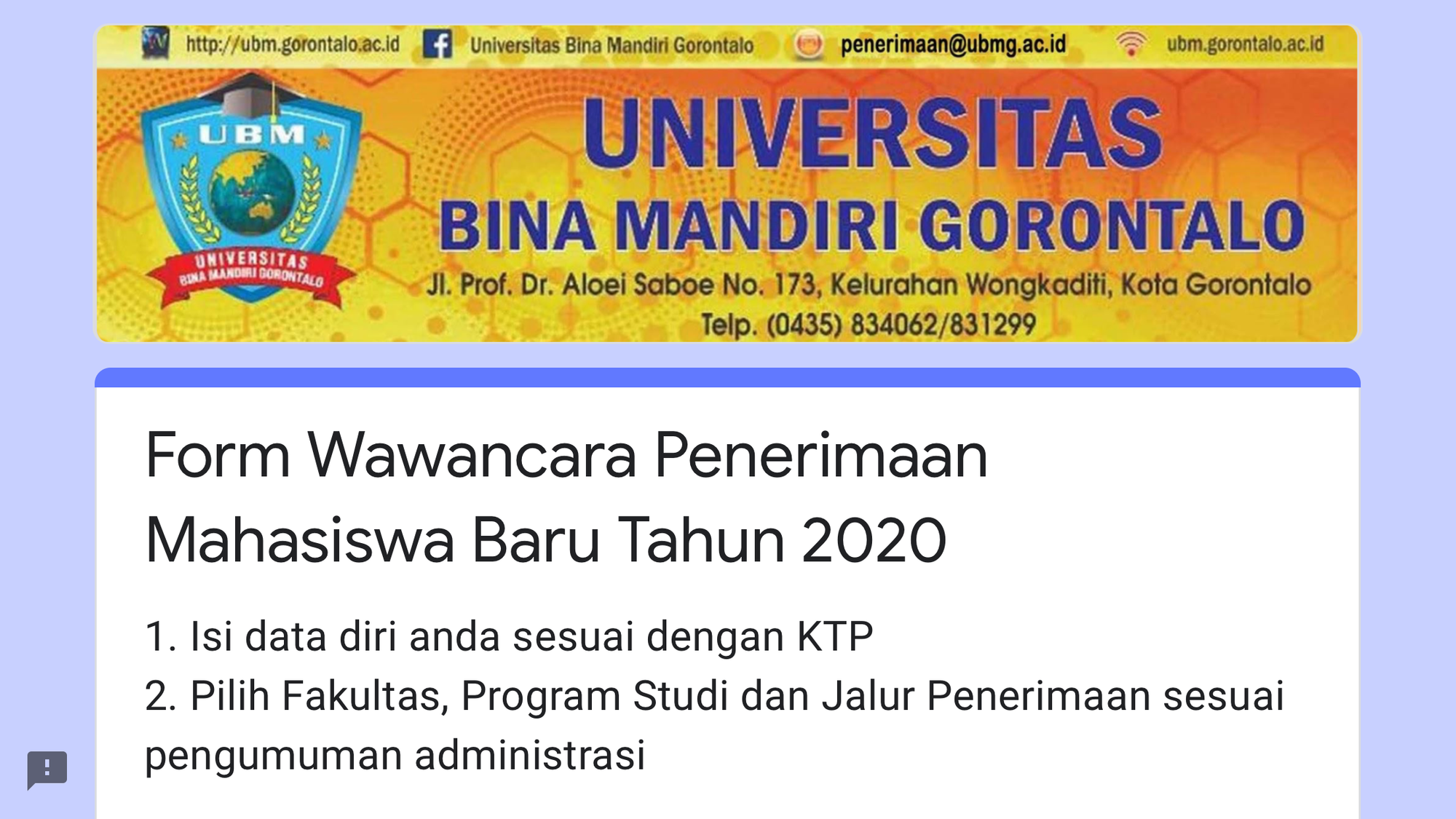 Sebanyak 242 calon mahasiswa baru UBM Gorontalo akan menjalani tes wawancara hari ini. Selasa, 14 April 2020. Tes yang digelar melalui online ini bisa diakses melalui website ubmg.ac.id. Untuk format tes https://bit.ly/Tes_Wawancara2020 selamat mengerjakan!