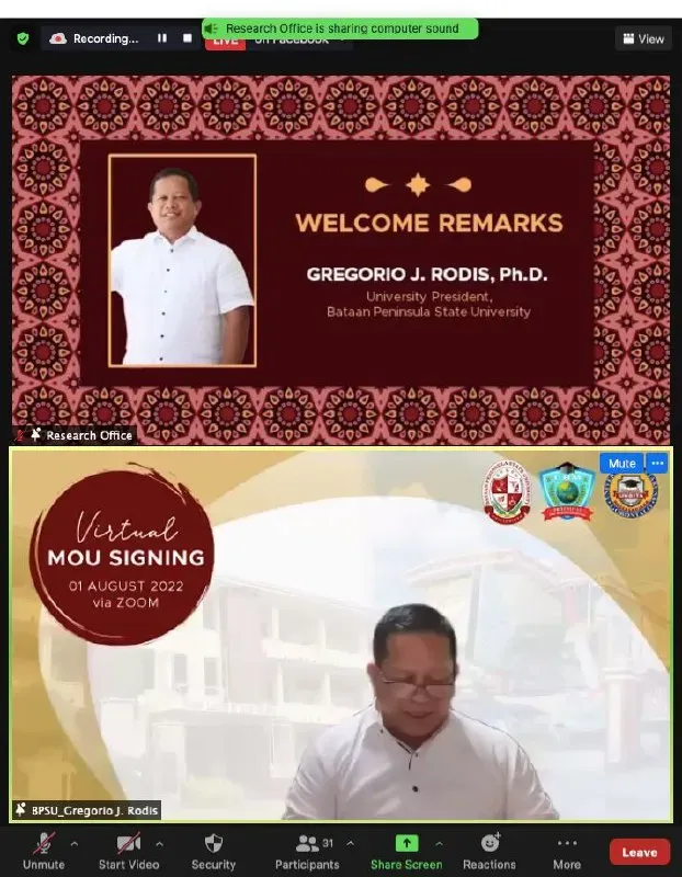 The virtual signing of the MoU signing was carried out jointly at the Bina Mandiri Gorontalo Ballroom, and the BPSU Meeting Room by the Rector of UBM Gorontalo, Dr. Hj. Titin Dunggio, M.Si, M.Kes and President of Bataan Peninsula University, Philippines Gregorio J. Rodis, Ph.D, and Director of Postgraduate Unbita Prof. Dr. Arifin Tahir, M.Si. Also present were representatives of all faculties, heads of institutions both within UBM Gorontalo and Bataan Peninsula State University.
