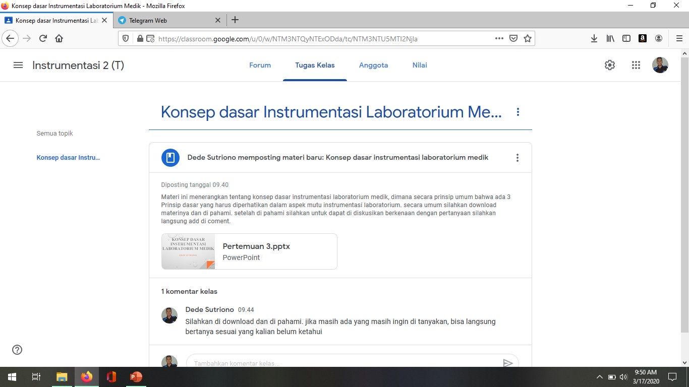 Capt : DARING - Tampilan pembelajaran daring melalui fasilitas google classroom dengan mata kuliah instrumentasi 2 oleh dosen yang juga Dekan F-STIK, Dede Sutriono S.Si, M.Si untuk mahasiswa program studi D3 Analis kesehatan dalam menindaklanjuti surat edaran rektor.