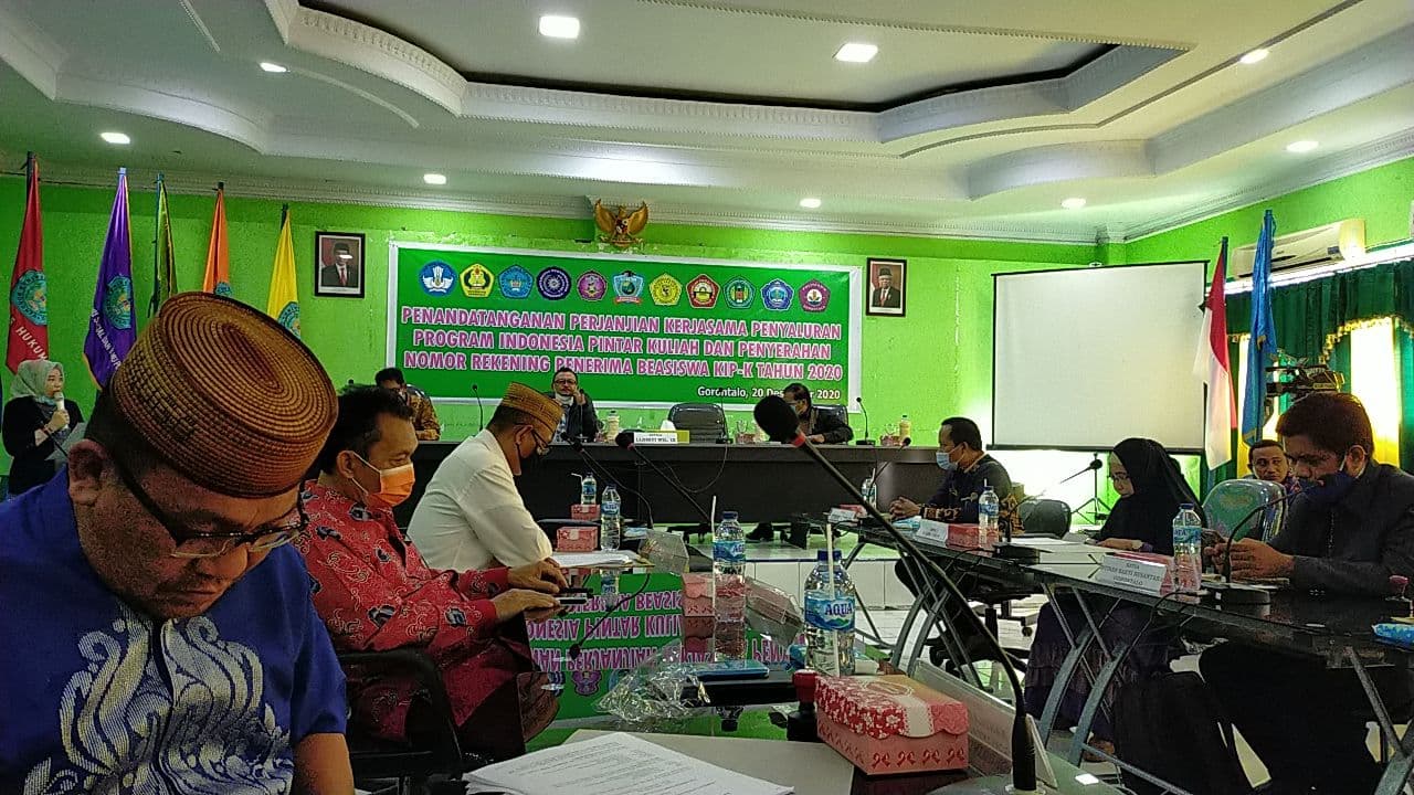 KAMPUS UBMG - Universitas Bina Mandiri (UBM) Gorontalo lakukan penandatanganan Perjanjian Kerjasama (PKS), penyaluran program beasiswa Kartu Indonesia Pintar Kuliah (KIP-K), dan penyerahan nomor rekening penerima Beasiswa KIP-K Tahun 2020. Ahad (20/12/2020).